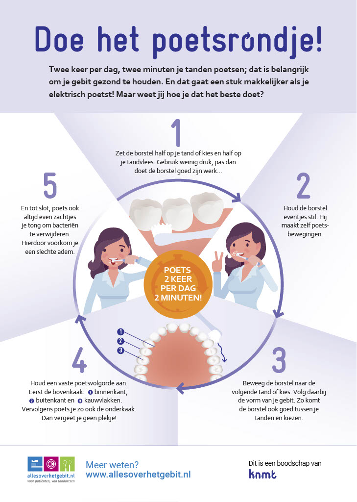 Uit klinisch onderzoek blijkt dat een elektrische tandenborstel plak beter verwijdert dan een hand-tandenborstel. Wij adviseren daarom om dagelijks twee keer minimaal twee minuten elektrisch te poetsen. Wil je weten hoe je dat het beste kunt doen? Leer jezelf het poetsrondje aan!